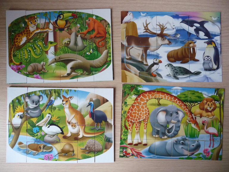 Но вот эти самые квадратики маленькие (больше размером, например сразу 4 квадратика, не сделать из-за перфорации) и из тонкого картона. В результате, картинку очень сложно собрать не только из-за размеров "пазлов", но и потому что требуется ловкость, чтобы не сдвинуть остальные карточки. И дети и я были разочарованы, игра убрана подальше. Но! Я наклеила эти карточки на самоклеящуюся пенку, снова вырезала и стало играть удобнее, т.к. пазлы обрели объем да и скользили по образцу меньше. Как хорошо, что вырезанная карточка оказалась только одна, потому как остальные карточки с пазлами я полностью наклеила на пленку и вырезала уже по разному (по 4 квадрата, по несколько квадратов по вертикали и т.п), то есть пазлы для выкладывания картины получились разной степени сложности. А то, что каждая картина-пазл приклеена на пенку одного цвета, облегчает поиск и сортировку пазлов.