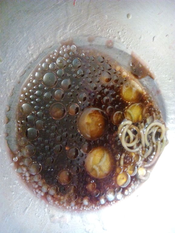Макароны остались в воде, монетка опустилась на дно, крышка от бутылки плавала в масле.