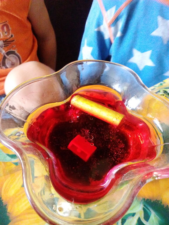 Деревянная палочка осталась плавать в самом верху, а деталька лего в спирте утонула, а в масле задержалась.
