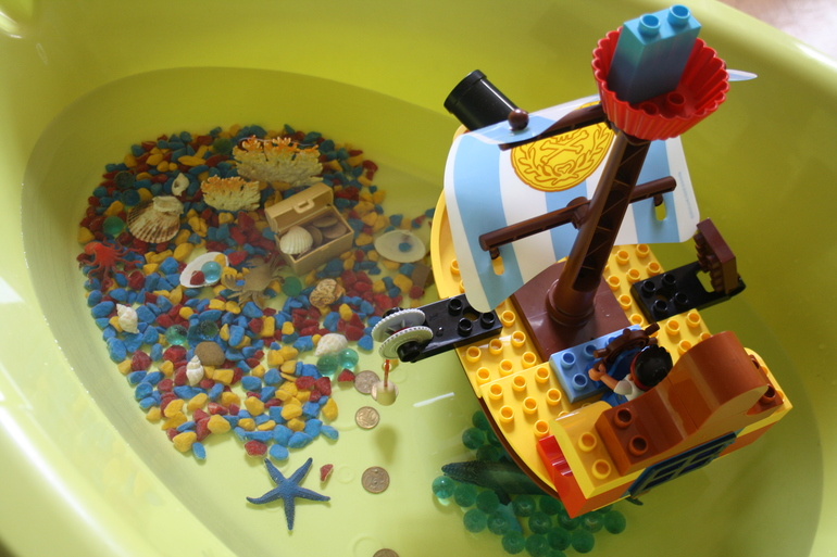 Наполнение морского дна: цветная галька из зоомагазина, стеклянные шарики - марблс, ракушки, морские камешки, сундук лего, набор фигурок морских обитателей.