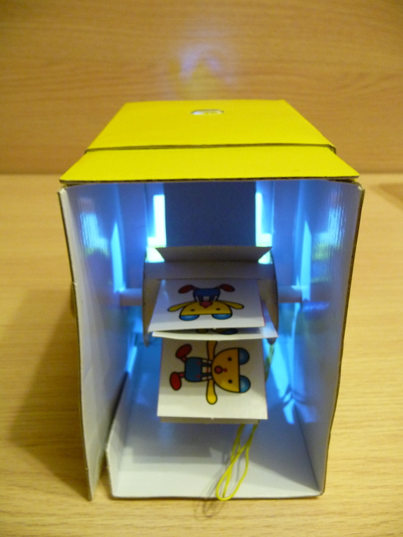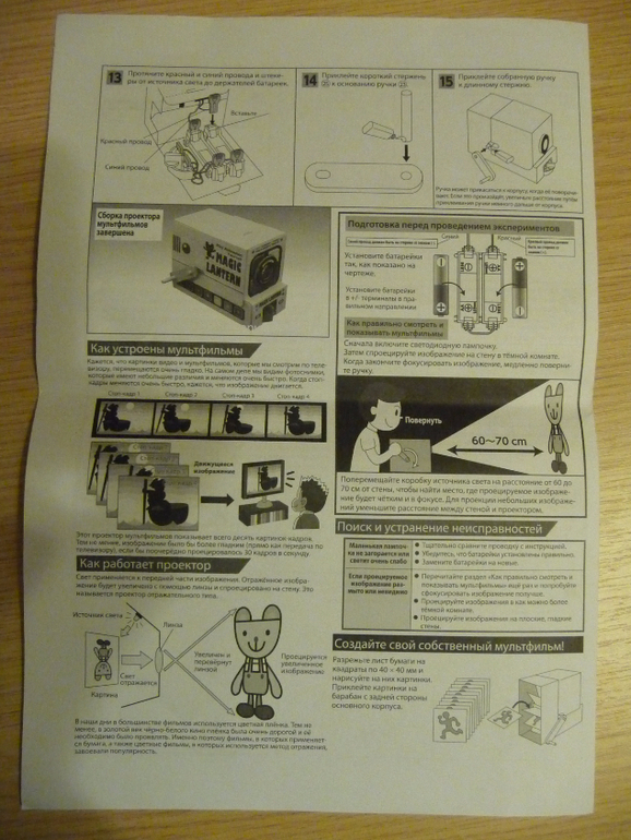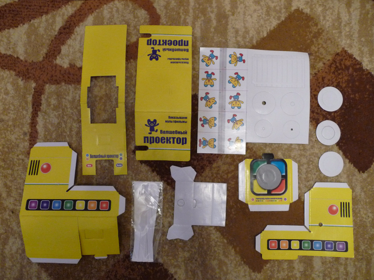 Вообще-то это конструктор. Собирали всей семьей. Начинала я с сыном (помогал собирать барабан), а завершил сборку - муж. Времени затратили часа два, может три... В принципе, не так уж и сложно. Собрали, повесили простыню, выключили свет и вот оно - волшебство! Дети по очереди начали крутить ручку, улыбались и радовались : )) Хватило их конечно ненадолго... Эх, современная молодежь : ((