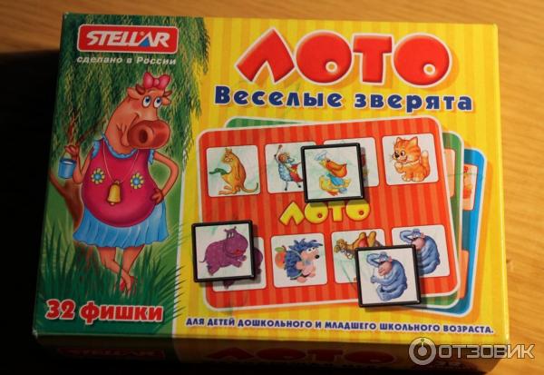 Там же купила лото "Веселые зверята" от Стеллар за 120 рублей. Тематики лото есть разные, мы обожаем зверюшек ). Особый плюс - фишки сделаны из пластика, для малышей самое то, а игровые поля-карточки из картона, планирую их заламинировать.