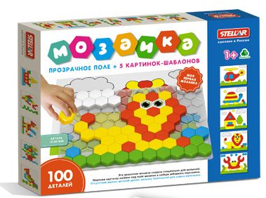 У мозаики прозрачное поле, куда вставляются 5 разных трафаретов. Размер поля 46*35 см, диаметр фишек 4 см, не страшно, что деть проглотит. Моя этим до сих пор страдает ))) Такие аналоги, например Quercetti, стоят 400-500 грн.
