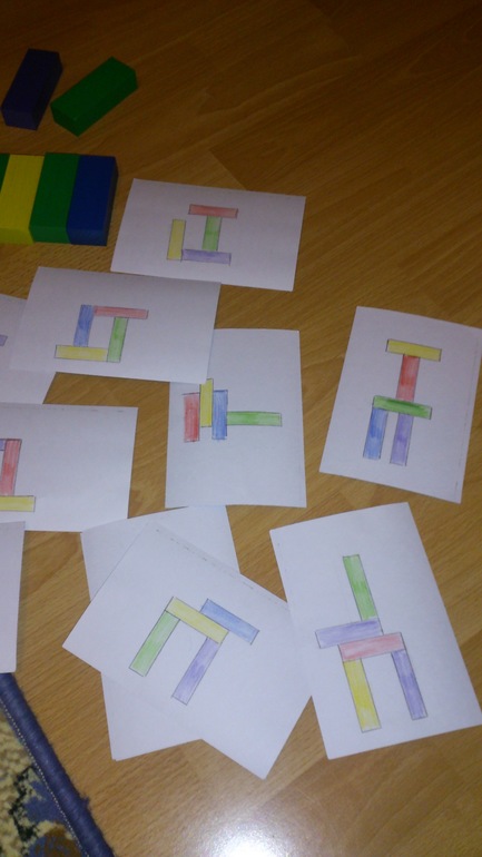 А схемы рисовала быстро, минут за 15-20. В каждом рисунке не более 5 кирпичиков. Можно усложнять, менять плоскости (горизонт.,вертикал.), сравнивать постройки, играть в "Найди отличие". Кстати, можно исполтзовать счетные палочки, но тогда только в горизонт.плоскости.