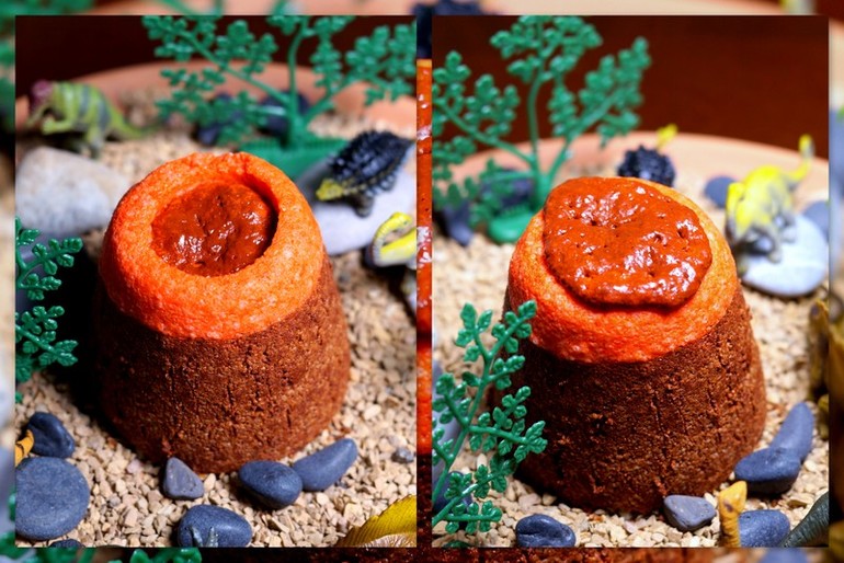 Пищевую соду и лимонную кислоту перемешиваем с растительным маслом и разделяем на две неравные части. Одну часть делаем значительно меньше и подкрашиваем красной масляной краской (это будет жерлом вулкана). Другую, большую, часть ( само основание вулкана) красим в коричневый цвет.