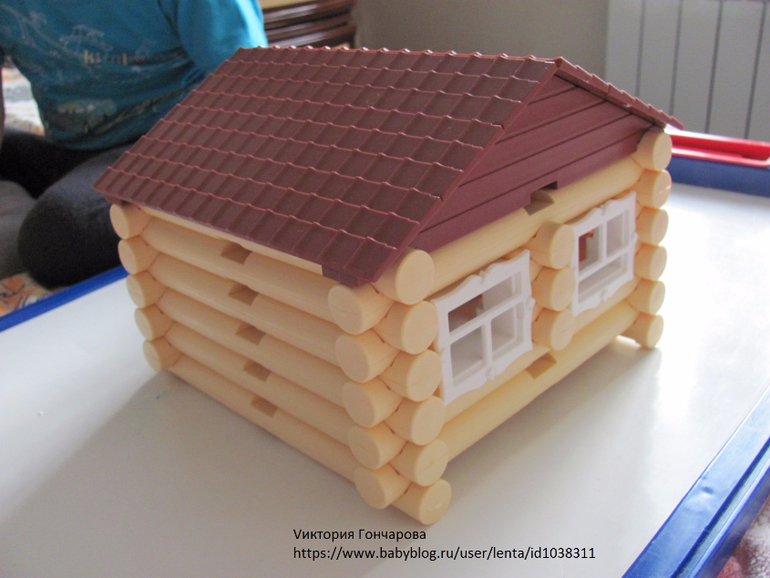 Что понравилось ребенку - бревнышки получаются как у нас на даче))), ну и как в книге про Муле Мека. Далее двери и окна открываются, имеется черепица в качестве крыши.