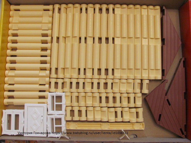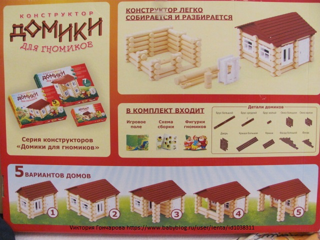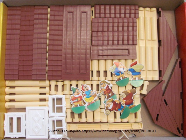 Полный состав: - полубрус большой - 33 шт, длина 18 см, - полубрус средний - 30 шт, длина 10,5 см, - полубрус малый - 94 шт, длина 3 см, - окно большое - 1 шт, - окно малое - 2 шт, - дверь - 1 шт, - крыша большая - 6 шт, - крыша - 4 шт, - фасад большой - 2 шт, - фасад - 2 шт., - игровое поле - 1 шт - фигурки гномиков - 5 шт. - инструкция по сборке - 1 шт
