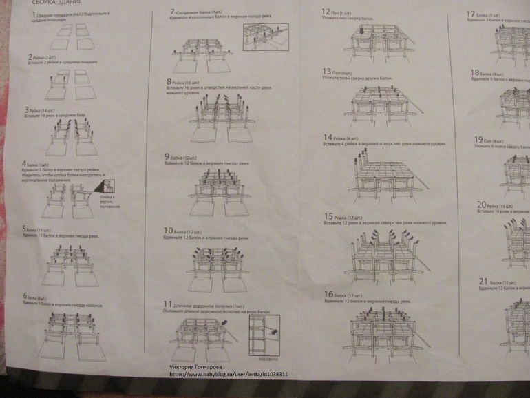 В набор входит - 186 реек, 230 балок, 28 стоек, 8 скошенных балок, 2 дорожных полотна, 25 элементов пола, 6 средних площадок, шкив, 4 направляющих лифта, лифт, 60 картонных панелей, иллюстрированная инструкция на русском языке