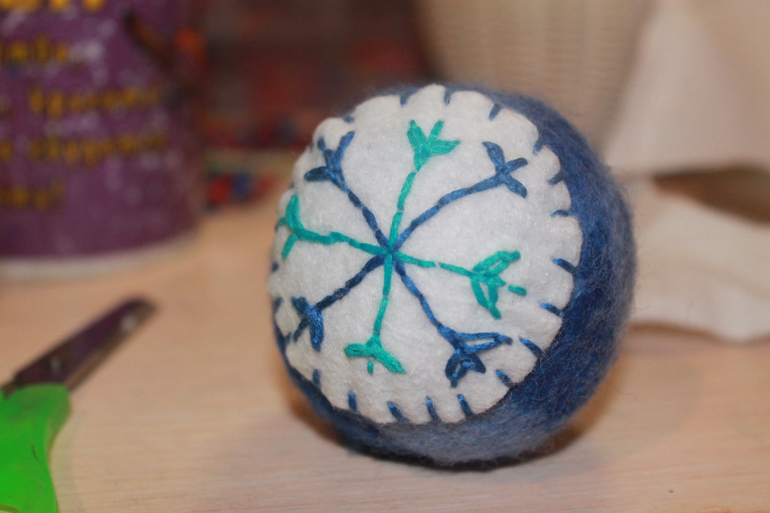 А потом на них пришиваем вышивку на фетре. Еще хочу аппликацию из фетра, чем его можно клеиь? и еще хочу попробовать Еве показать приемы чухого валяния - приваляем елочку и снег)) в общем - все ребенку по силам,осталось ниточку прикрепить))