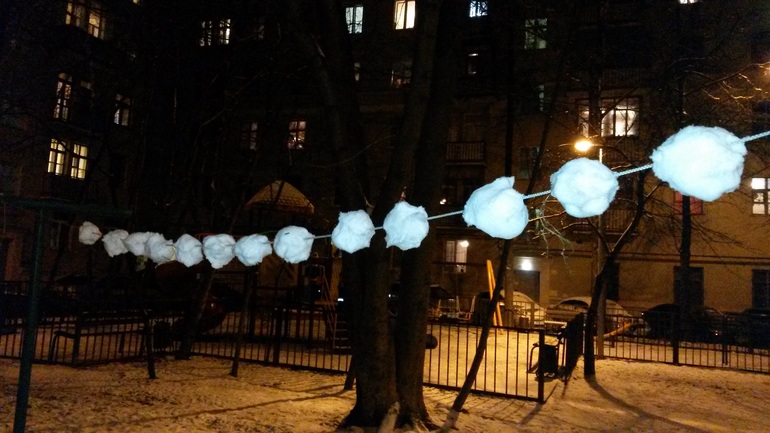 Вешаю шары на ветки, Коля сбивает их лопатой. Снова вешаю, снова сбивает и так много- много раз.