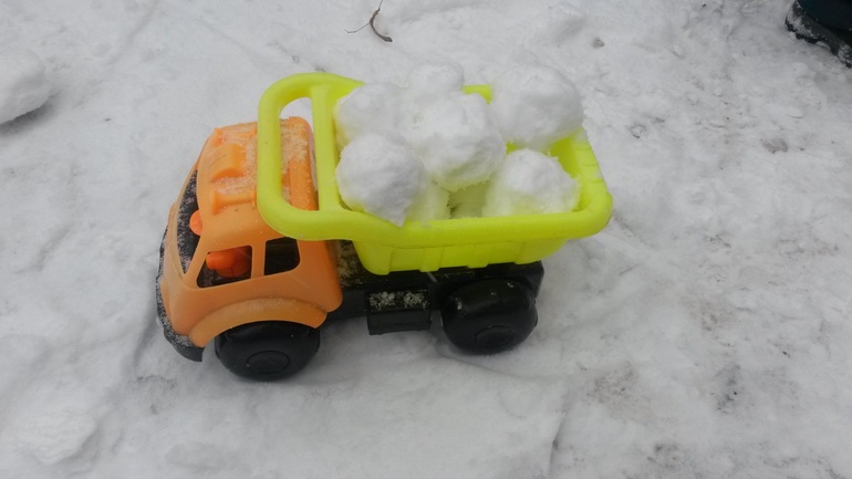 Заготовка и перевозка снежков. Любим их с горки скатывать.