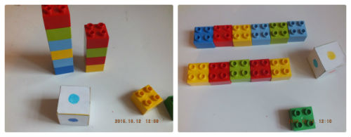 Но гораздо интереснее оказалось играть в лего. Поэтому я решила совместить лего и "игру по правилам". Склеила кубик (точнее обклеила готовый), на каждой грани которого нарисовала цветные кружки. Раздала кубики - себе и Семе. Мы кидали кубик и строили башни. Сначала у кого выше, потом у кого длиннее.