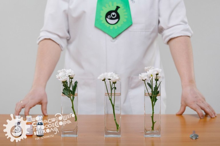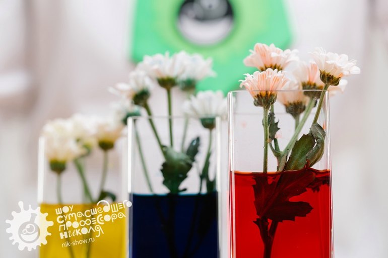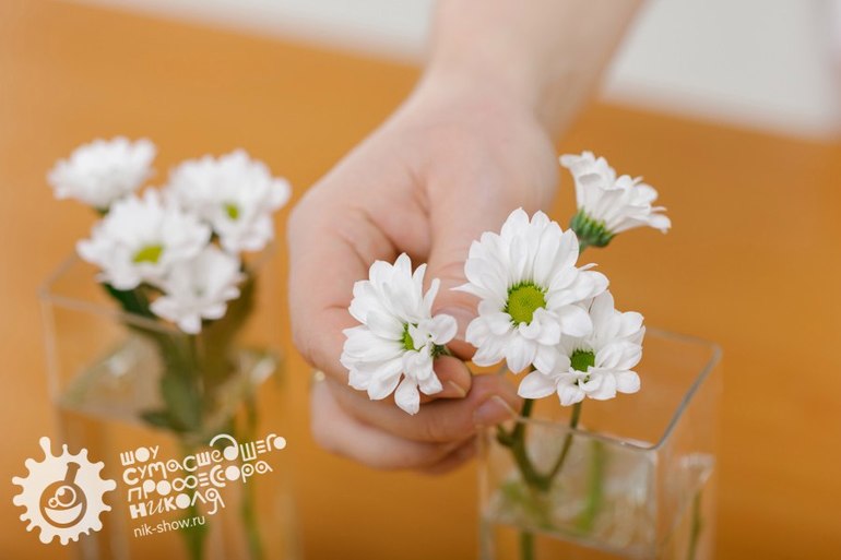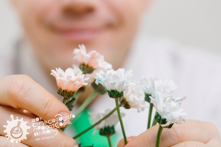 Цветы впитывают воду, в результате чего окрашенная жидкость разносится по капиллярам и окрашивает цветок.