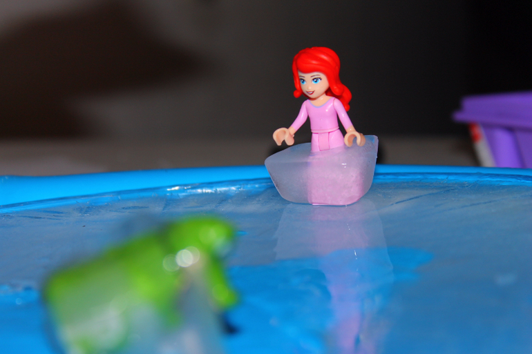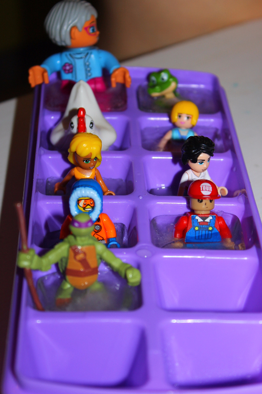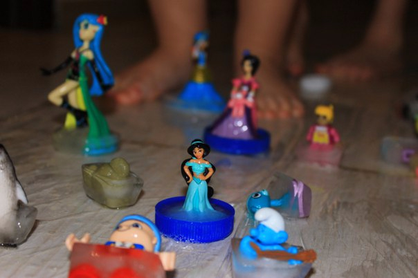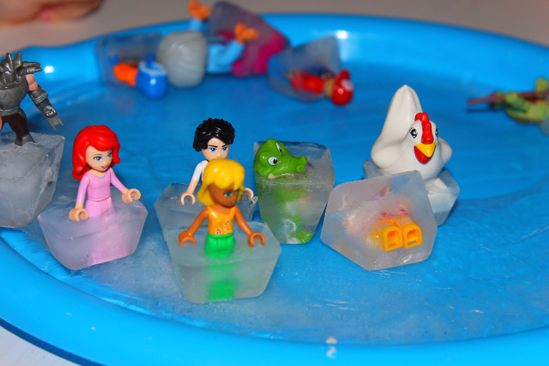 Каток -замороженая на подносе вода. Но поднос у нас стоял не очень ровно и заморозилась вода неравномерно, получилась даже небольшая горочка, игрушки сами скатывались с нее.