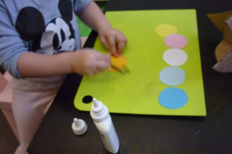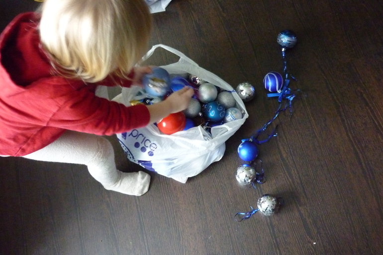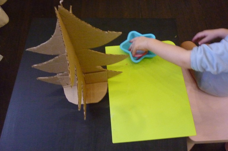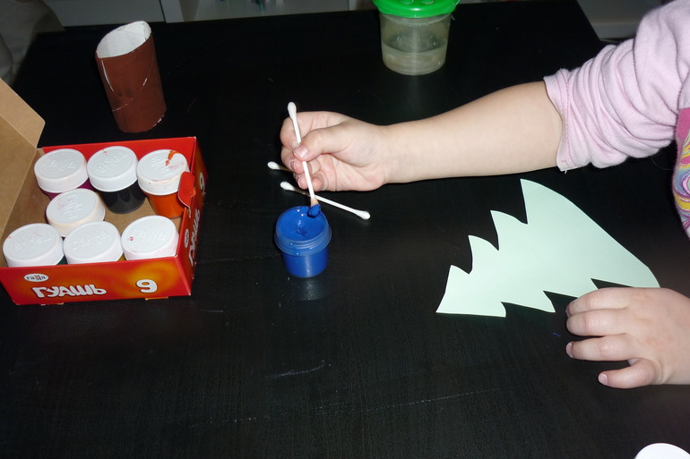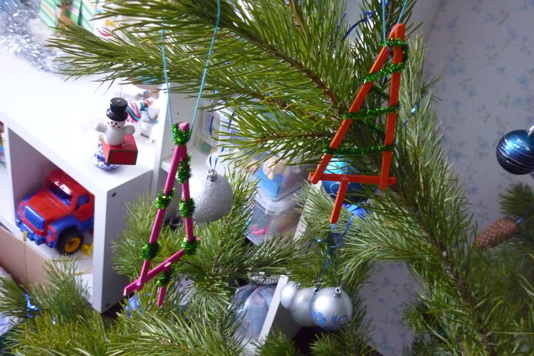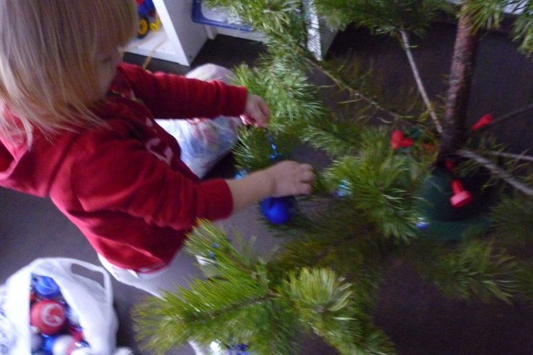 Мама собирала, а Саша подавала детали. Сашка решила, приукрасить сверху елочку желто-красным