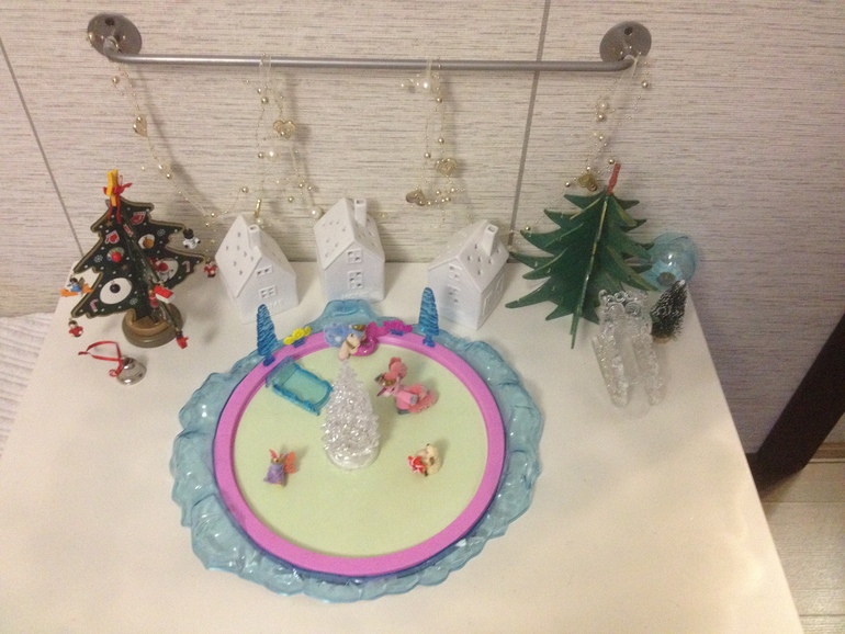 Также у нас был волшебный домик под елкой, с катком и зимняя деревушка на столе