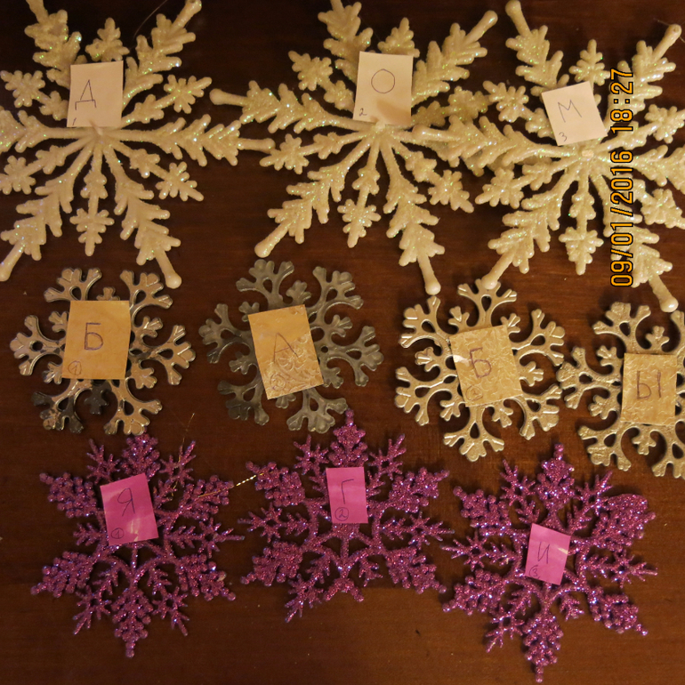 5. на одном из окон задание - найти 10 снежинок, поиск ограничим одной комнатой. На каждой снежинке - буква. У меня три вида снежинок, и получится три слова - Дом Бабы Яги. (есть у нас такой дом)кроме буквы на каждой снежинке есть еще и ее порядковый номер, сами буквы сделала тоже разных цветов.