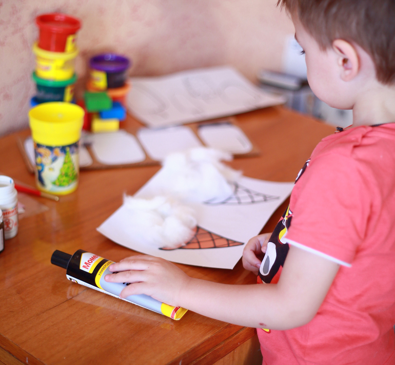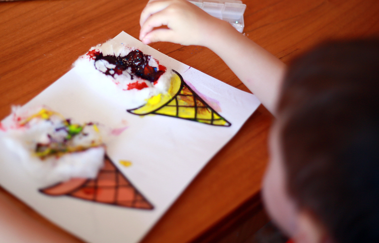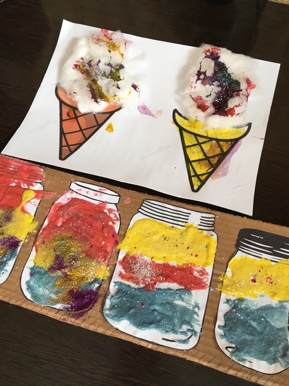 Прочитав стих про эскимо, рассмотрев его на картинке мы начали готовить свое мороженое. Наполняли рожок, добавляли "ингредиенты", украшали. На шаблон приклеили вату, разукрасили ее и посыпали блестками.