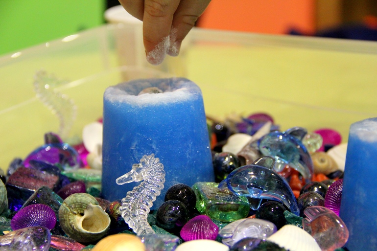 Спасатели. Берем пластиковую форму, накладываем в нее морских существ, заливаем водой, замораживаем. Только начинаются вопли: " поиграй со мною", достаем нашу заготовку, даем соль и начинаем спасательную операцию.