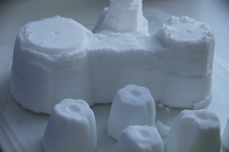 Можно конечно сделать в простом стакане, нооо эффект не тот, делать что-то глобальное - у меня нет сил, поэтому выход был найден таким способом: берем одноразовый стаканчик (у меня нашлись бумажные), добавляем приблизительно 40-50 гр лимонной кислоты, заливаем теплой водой не доходя до краев см 1.5, размешиваем, остужаем, добавляем чуток голубой краски для цвета и в морозилку до полного замерзания (или на балкон, погода позволяет). Все, наш вулкан готов. За раз я делаю 4 штуки, вот такая любоФФь. У нас есть сенсорная коробка со всякой морской мелочевкой, ставим в нее наши вулканчики, посыпаем содой и наслаждаемся процессом. Если реакция не очень бурная, можно полить сверху горячей водичкой. Ляпота. Ден зависает часа на полтора, я рядышком делаю свои дела, поглядывая одним глазком.