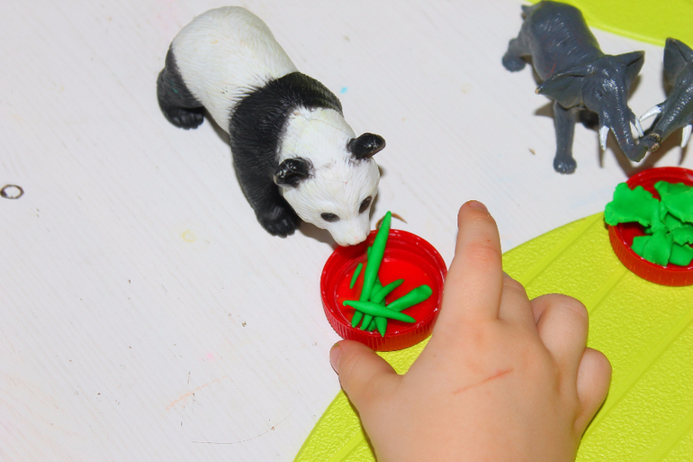 При лепке лакомства животным используем детские пальчики по-максимуму. Катаем яблочко для лошадки, отщипываем травку для бегемота, катаем "колбаски" бамбука для панды и т.д.