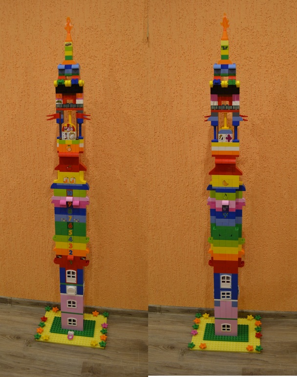 Башню до потолка мы уже делали, выше Папы тоже. Решила помучиться и сделать по цветам :) Кирилл мне активно помогал, отбирая нужные детальки и пробуя каждую на вкус. а Камилла давала нужные кубики и собирала цветочки, чтобы потом украсить площадку под башней.