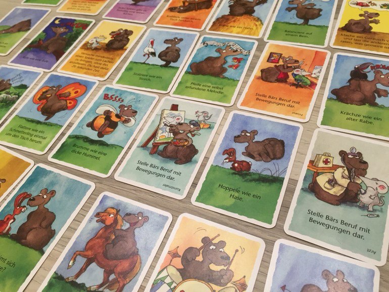 Оранжевые карточки - содержат задания (порхать как бабочка, стоять на одной ноге как цапля, рассмешить соседа за 20 секунд, изобразить художника, сову,.., прыгать как зайчик, и т.д.).
