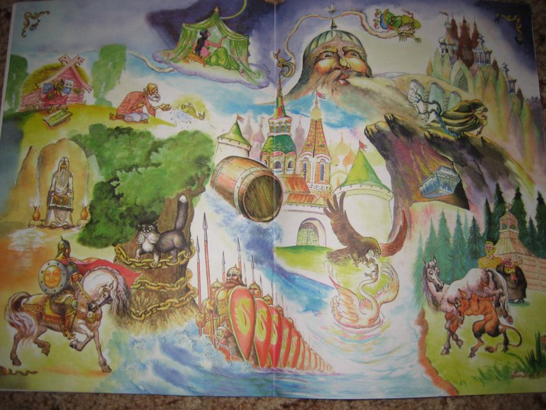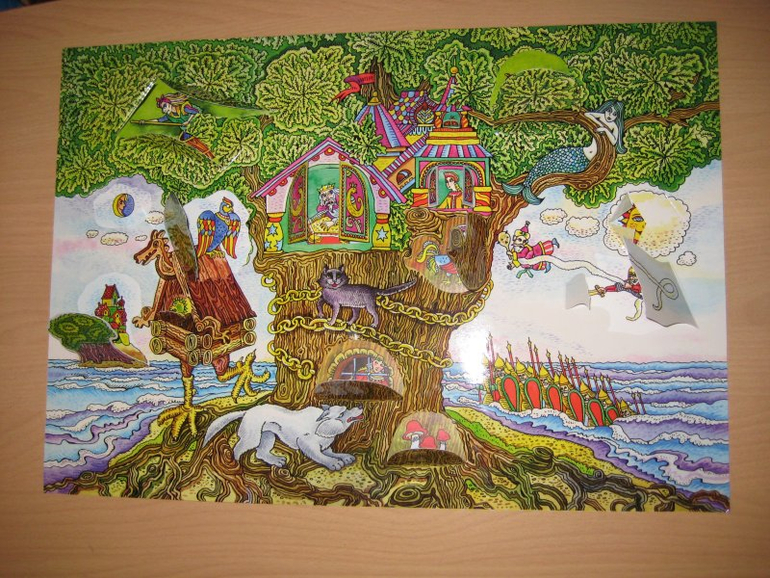 Плакат посвящен стихотворению Пушкина Лукоморье и все герои, как раз и прячутся за окошками и еще несколько дополнительных (Солнышко, яблочко, грибок...) Всего 20 окошек