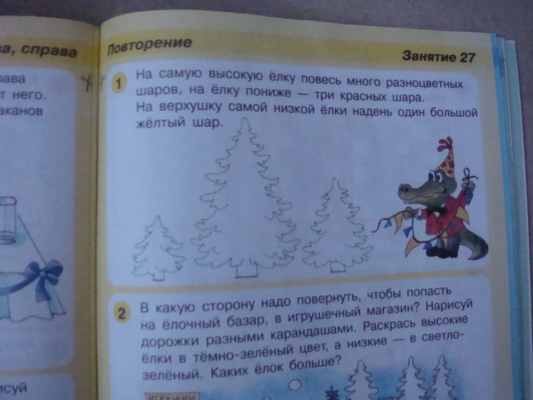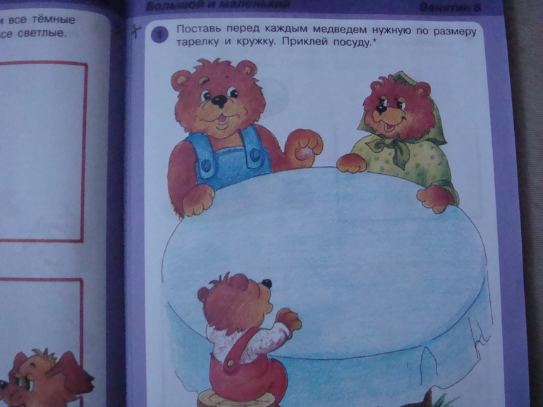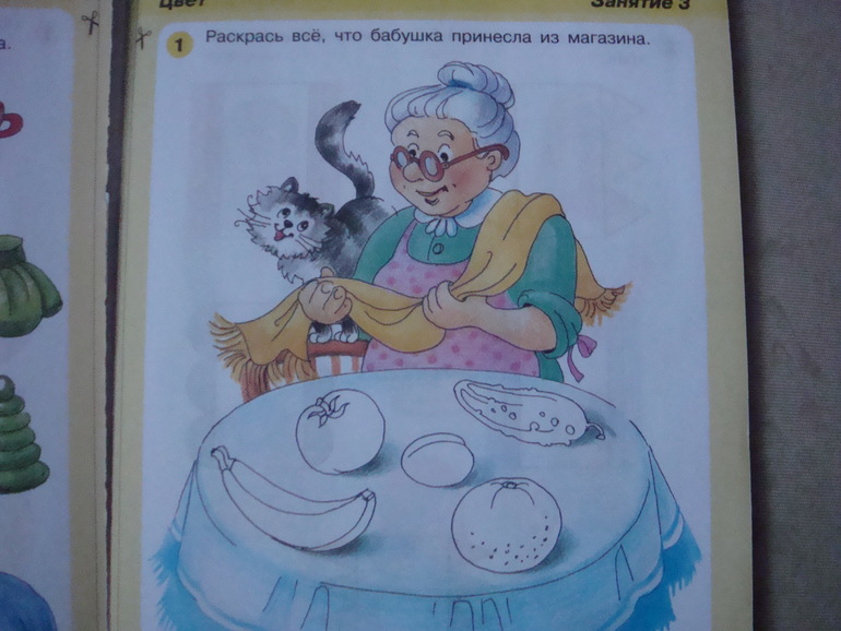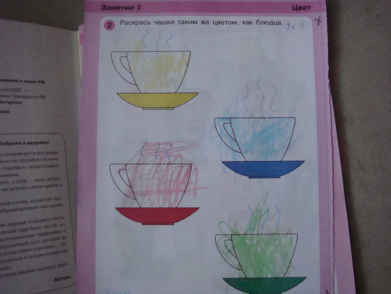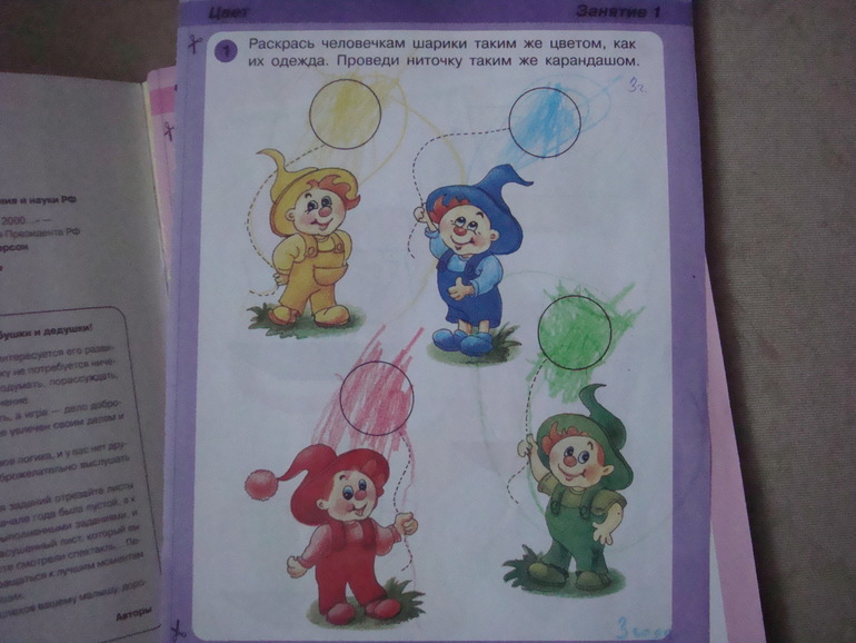 Для занятия рекомендуется вырывать страничку, а не давать книгу целиком. И это правильно. Моя дочка, например, сразу бы стала рисовать везде, где придется.