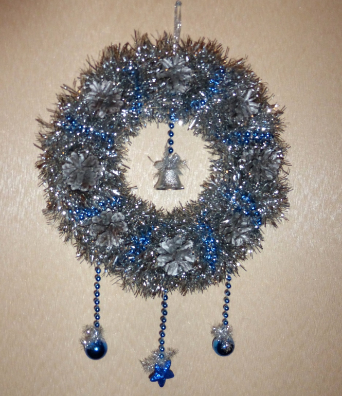 Тут все просто. Берется толстый картон, вырезается основа 2 шт, склеивается, обматывается мишурой и дальше - украшай как хочешь.