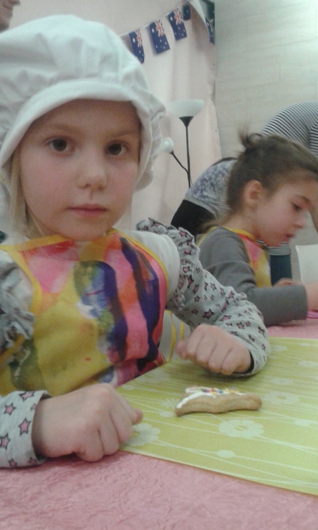 А потом расписывать глазурью печенья: дети помогали делать глазурь, активно дегустировали ее и, наконец, расписывали печенья в форме бумеранга, коалы и кенгуру. Печенье было сделано по традиционному австралийскому рецепту с пряностями. Так что понравилось больше мне, чем Симе. Дочка была в восторге от процесса.