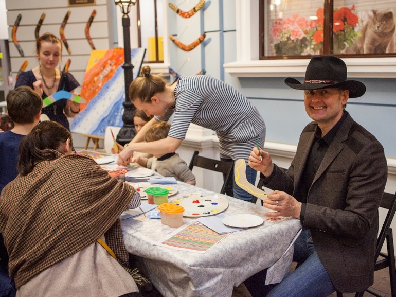 Вместе с Габриэлем Козуланом, главой австралийского культурного центра и настоящим австралийцем (дядя в шляпе) можно было расписать бумеранг в традиционной технике.