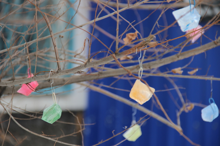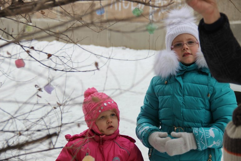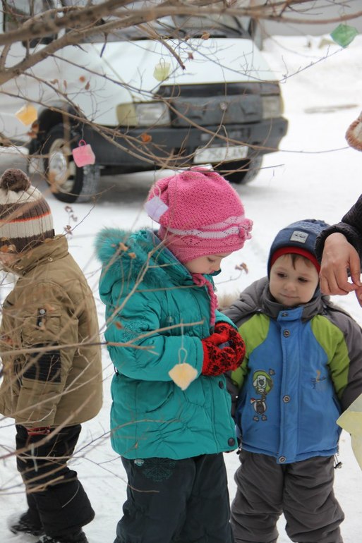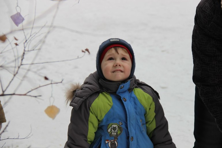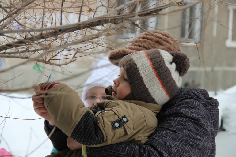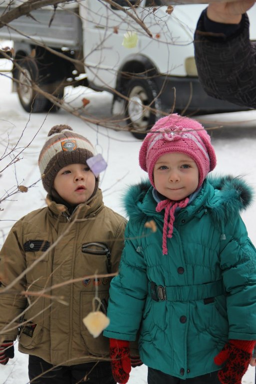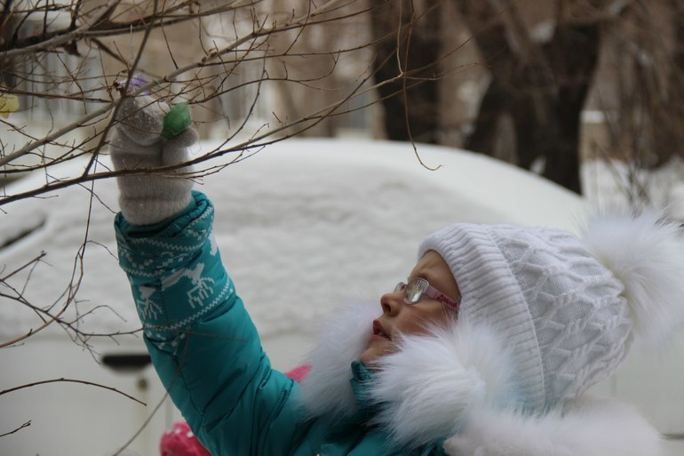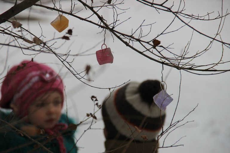 Пока мы вешали ледышки - по очереди, Максим тряс дерево за ветку, отчего только что повисшие ледяшки послетели в рыхлый снег