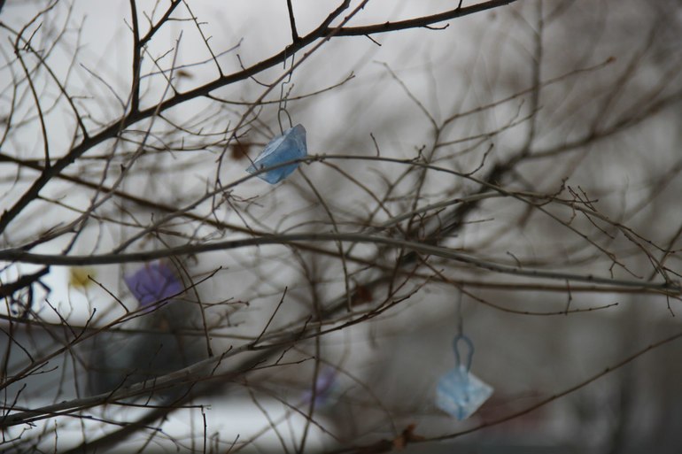 Украсить его мы собирались к новому году, но дожди как-то совсем тому не способствовали, и заготовленные украшения пару недель валялись в морозилке. А 31 декабря пошел настоящий новогодний снег - хлопьями. И наконец, наступила зима, похожая на зиму. И украшать дерево мы отправились перед рождеством, накрасив и наморозив еще партию кубиков с воткнутыми в них проволочными петлями. Удобнее всего вешать игрушки на ветки при помощи разогнутых канцелярских скрепок, для чего и были вандально раскурочены все скрепки, нашедшиеся в доме.