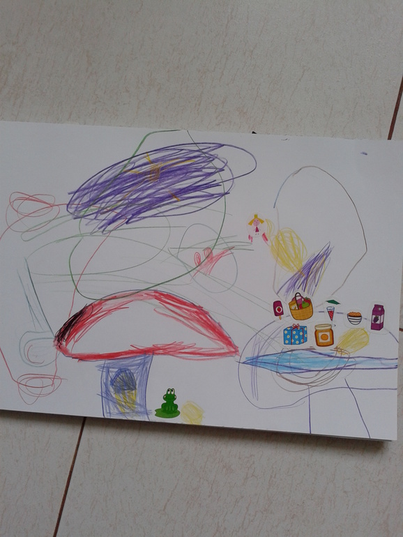 Начали с маленькой принцессы, потом Соня нарисовала колодец (это вот тот "грибок" на синей ножке). Затем появился лягушонок и золотой шарик. Потом шёл рассказ далее по сказке, королевский стол с яствами (ну это что у меня было в запасах из наклеек-еды). Фиолетовое пятно - это туча, за которую спряталось солнышко, когда заплакала принцесса. Слева абстрактная кроватка принцессы. Зеленое лицо с красными глазами - это уже принц после волшебного превращения от поцелуя принцессы.