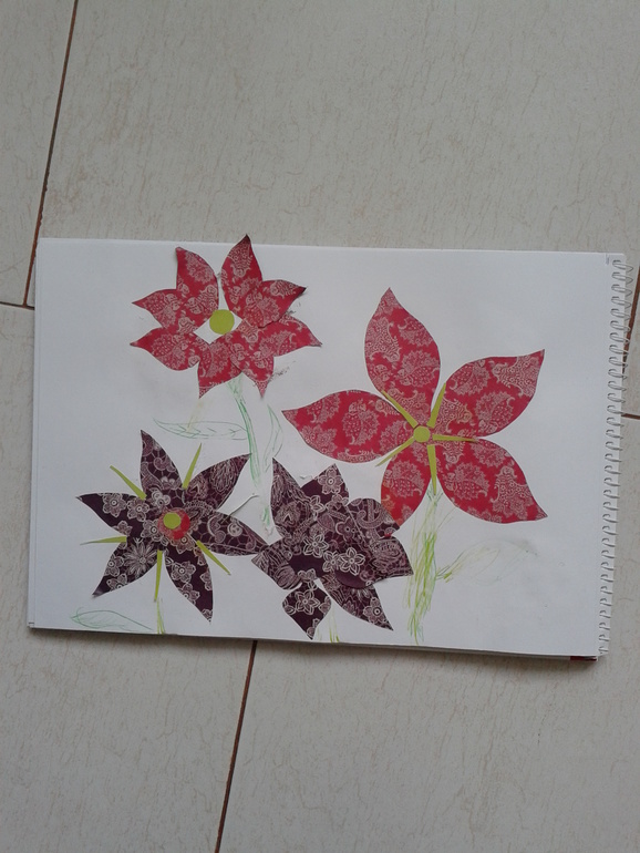 Думаю легко понять какие цветы Соня клеила сама, а какие с моей помощью. Это к вопросу о том, что некоторые говорят о предоставлении полной самостоятельности в творчестве. Даже видя перед собой пример, она "искала свой путь". Я предлагала красивый вариант тюльпановых цветов, но она его решительно отвергла, хотя было красиво. И своими цветами была вполне довольна. Возможно ребенок и должен доходить до многого сам, но сколько надо этого многого ему сделать-переделать, вот в чем вопрос. Беда взрослых в том, что мы хотим результат быстро, сейчас, и часто не готовы ждать годы, чтобы увидеть, к примеру, самостоятельную аппликацию с красиво наклеенными цветами.