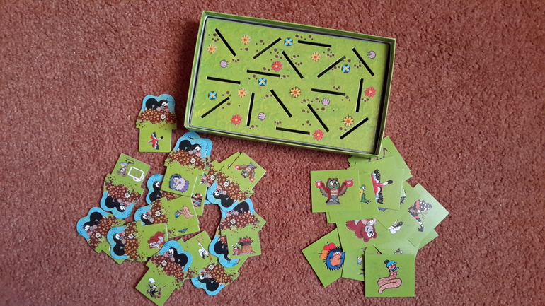 Игра очень добротно сделана, коробочка и карточки с Кротиком из очень плотного картона. Карточки со зверюшками потоньше немного. Сама коробка небольшого размера.