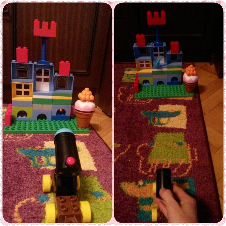 Тир. Используем пушку из набора рыцарский замок. Можно еще рядом собрать витрину с призами (например киндер - игрушками).