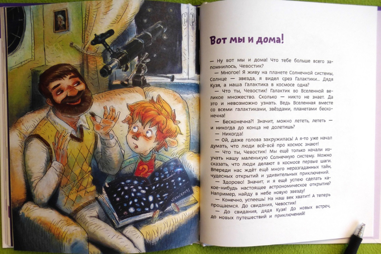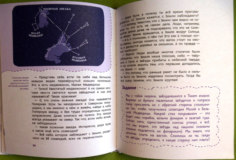 Отдельно хочется отметить наличие в книге увлекательных заданий для детей в конце каждой главы на закрепление пройденного материала. Это книга опытов и экспериментов. В ней много игровых заданий: создать Млечный путь и посмотреть на него со стороны, ориентироваться по звездам и сымитировать падение метеорита на Землю.
