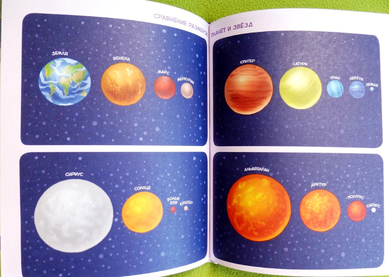 Есть отдельные развороты книги, где наглядно представлены самые известные созвездия и разворот где изображены планеты в сравнение по размерам со звездами.