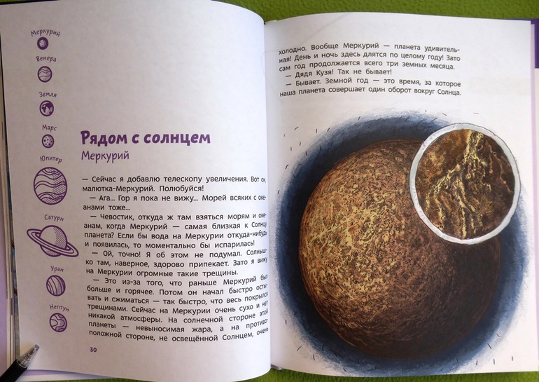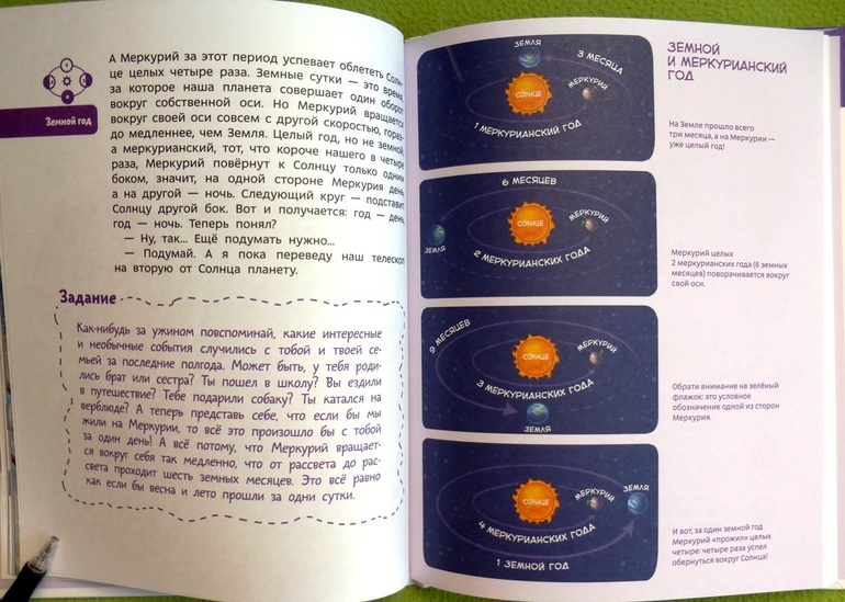 Интересный разворот книги, где на основе рисунка просто и понятно можно объяснить ребенку, что такое земной и меркурианский год, чем они отличаются