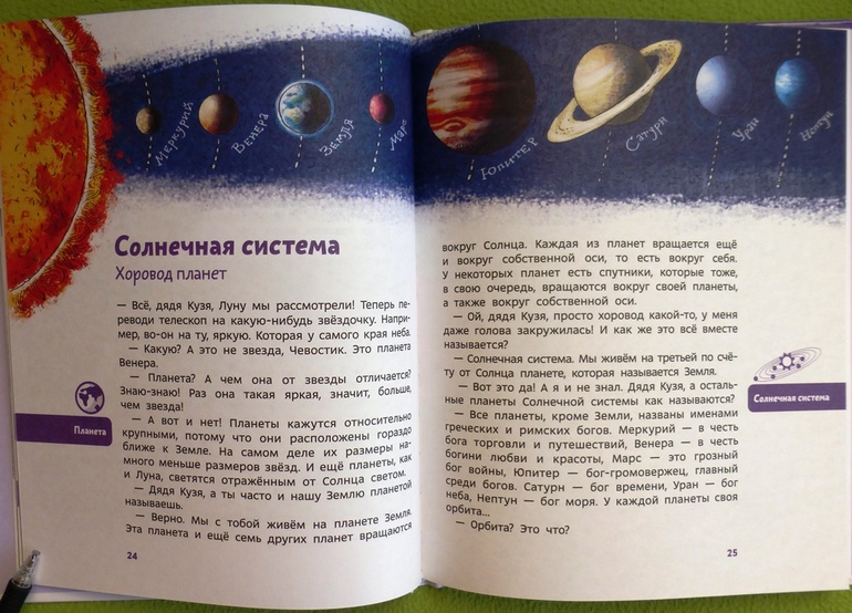 Очень интересный разворот книги «Хоровод планет». В этой главе простым и понятным языком объясняется, что такое солнечная система, на рисунке изображены все планеты. Рассмотрев рисунок, ребенок хорошо запоминает и названия планет и то, что Земля - третья по счету от Солнца планета. Рассказано, что все планеты, кроме Земли, названы в честь греческих и римских богов, кто бог чего, например: «Марс - это грозный бог войны, Юпитер - бог громовержец, главный среди богов. Сатурн - бог времени. Уран - бог неба, Нептун - бог моря».