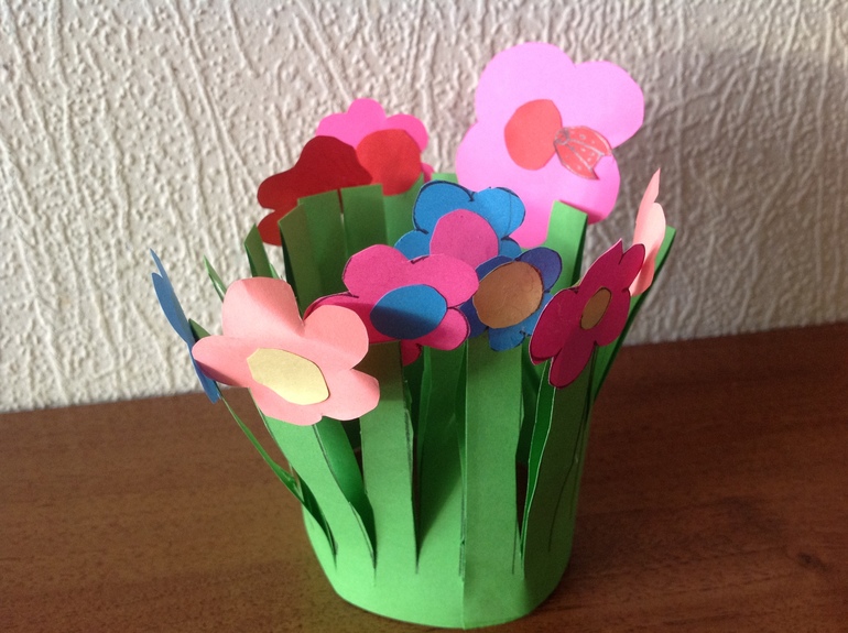 Праздник к нам пришел (Игры в День Рожденья, Новый год, 8 марта и.т.д.. А так же чем занять нескольСгибаем прямоугольный лист пополам и делаем надрезы (как для фонарика), склеиваем концы и травка готова! Потом самое интересное - приклеиваем любые цветочки, бабочки, жучки!
