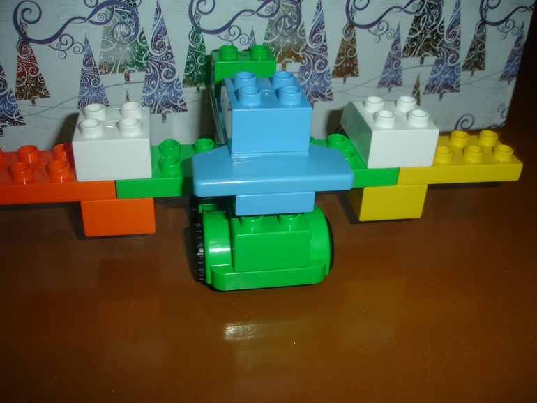 Можно собрать такого симпатичного робота. Если поставить обе ноги на основы с колёсами, то робот сразу становится мобильным, его легко катать. На "лице" маркером для досок можно нарисовать какое угодно выражение. К голове можно прикрепить "антенну" из любой детальки.Ещё у меня получился грузовичок (человечек на 2 фотке из набора "Стройплощадка" для наглядности):