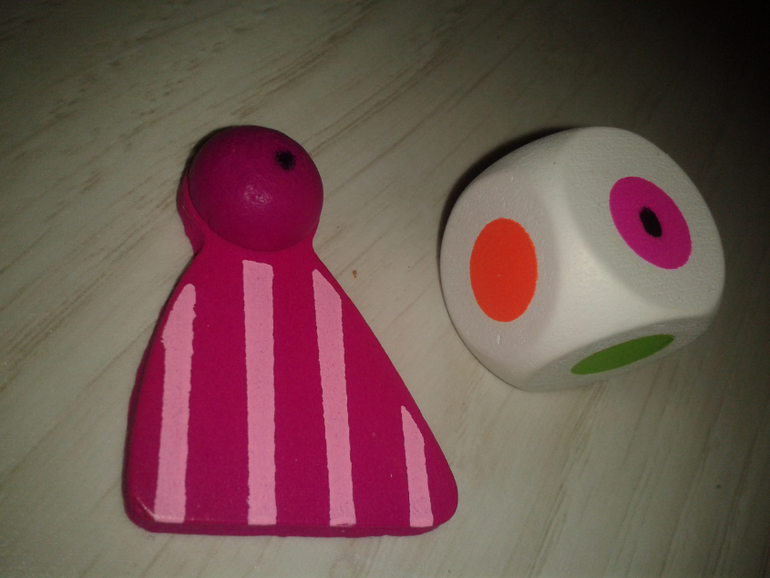 После броска на фундамент устанавливается деталь того цвета, которая выпала на кубике. Если такая деталь у игрока уже использована - он пропускает ход. Если выпадает цвет крыши - игрок устанавливает ее и в строительстве дома больше не участвует. Я поставила на детальку с крышей и на кубике с цветом крыши (малиново-розовый) черную точку маркером, т.к. ее легко спутать с красной ))