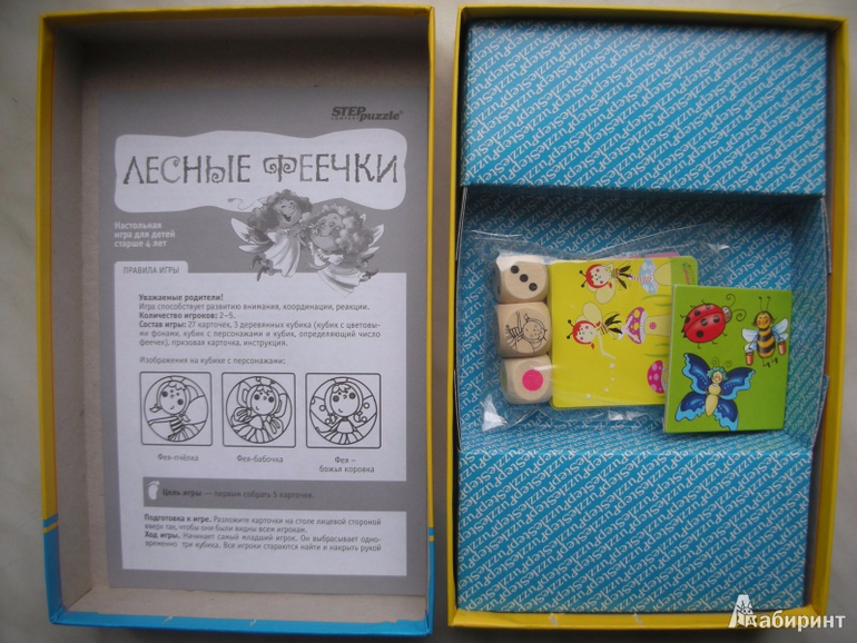 Суть игры в том, чтобы бросить все три кубика и быстрее всех отыскать нужную карточку, сопоставив все три характеристики: цвет, вид, количество.