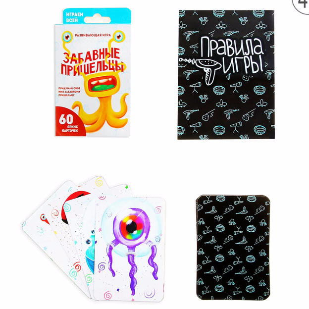 Еще одна карточная игра-забава развивающая память и приносящая море позитива. В ней 60 карточек с изображение забавных пришельцев. Каждого вида по 5 штук. Получается 12 разных картинок.