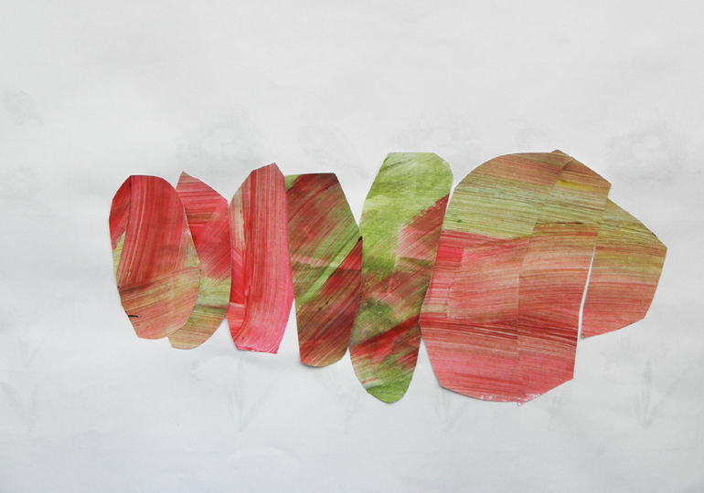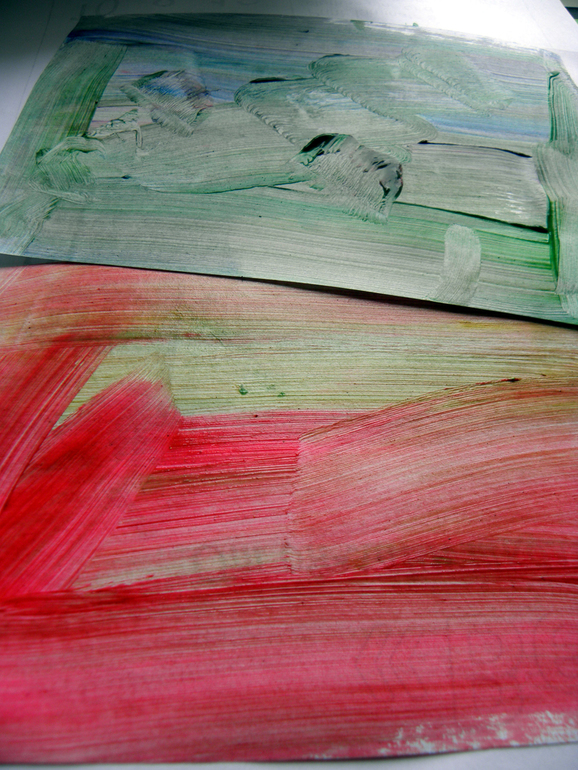 Для начала закрашивали листы краской. Дала грубую широкую кисть и 2 баночки с красками. Можно даже малярную кисточку дать, жесткие ворсины подходят для таких мазков:
