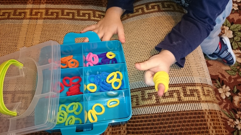 1. Купила цветные резиночки на Aliexpress. В Фикс-прайс бокс для их хранения, а заодно и сортировки. Теперь будем играть в Ring Ding.