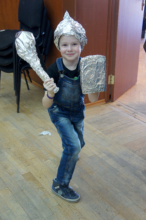 Ааа, да ладно! Умора! Вот это я отличилась!!!)))) Я отмотала такая кусок фольги себе для короны и к Диме пошла в другой зал проверить как он там. Иду обратно не торопясь, а там паника уже, фольгу утащили))